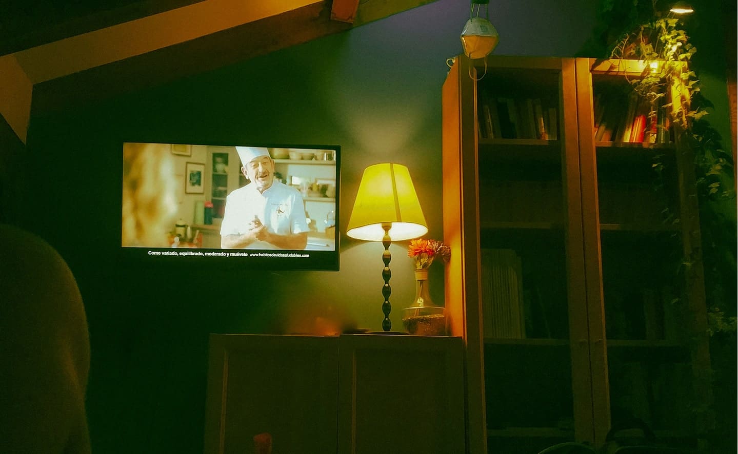 On the couch, Push & Twist the Flic Twist to start "Cinema": blinds down, ambient lights to 8 % amber, plugs turn on the soundbar, and Room Thermostat settles at 21 °C. Rotate clockwise to fine‑tune brightness; counter‑clockwise to lower volume via the smart plug controlling your AVR