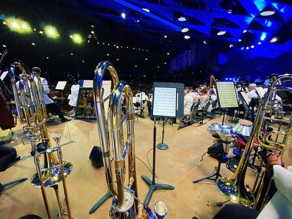 Cristina Cutts Dougherty, the tubist of the group tells us that as a group, they perform exclusively with their music on iPad’s, and they are always looking for new ways to streamline and make performing easier. They also stand to perform, making it difficult to stay focused on the performance while having to look down and locate a foot pedal to turn the page.